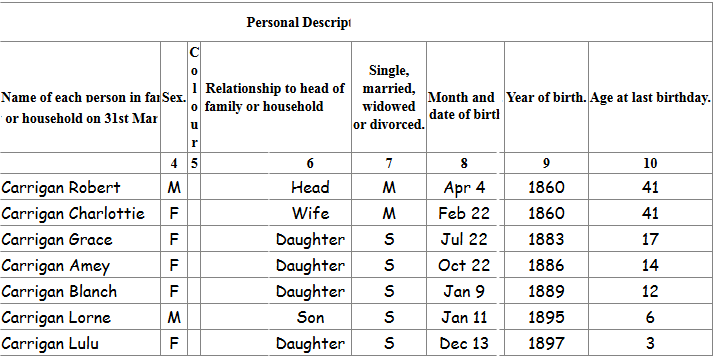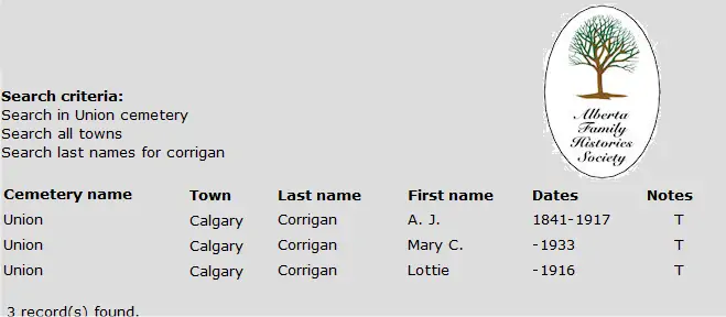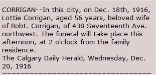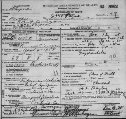Robert was the ninth child born in the Inkerman area to Robert and Margaret Corrigan. His father died when he was still a toddler. He must of aquired taloring skills as we find he is listed in the 1881 census working as a talor in Prescott Ontario and living with the McAdam's family. He married Lottie Pillar on 18 May 1881 in Russell Ontario. He contiued to support his family with taloring but switched to real estate agent by 1901. The 1916 census Has Robert, Lottie and two youngest children living in Calgary with Robert being an real estate investor. This moved may have been prompted by his daughter Grace move to Calgary as well as his eldest brother A.J. Lottie died in the winter of 1916 at the age 57. Her youngest Lexus was 14 at the time. After Lottie died, he remarried Flo Robertson. 1 By the 1921 census Robert had remarried with his new wife, mother-inlaw and his youngest living in Calgary. He died of bacterial endocarditis in Fordson, MI. The most common cause of death in patients with bacterial endocarditis is heart failure. He was visiting his son Lexus at the time.