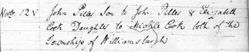 Married 12 November 1815 to Elizabeth Cook, daughter to Mickle/Michael Cook, both of Williamsburg. On Monday 8 th November 1824, John Pillar, innkeeper of Montreal, province of Lower Canada, bought lot #4 in the 3rd concession of Williamsburg township, Dundas County, Ontario for the sum of 500 pounds from John Wood. [Instrument # 105 registrars Office at Morrisburg, Ontario].
