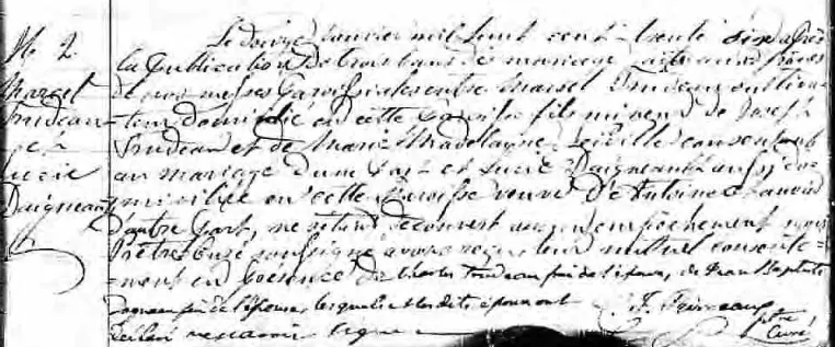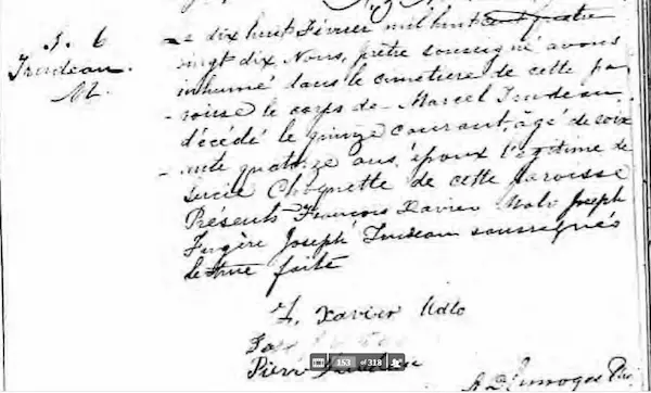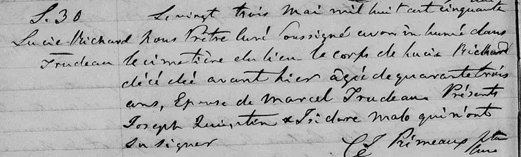 When Marcel Trudeau and his twin sister Marie were born on October 6, 1815, in St-Sulpice, Quebec, their father, JOSEPH, was 27, and their mother, Madeleine, was 23. He married Lucie DAIGNEAU RICHARD and they had seven children together. He then married Lucie Choquette and they had one daughter together. He died on February 18, 1890, at the age of 74, and was buried in Beloeil, Quebec.